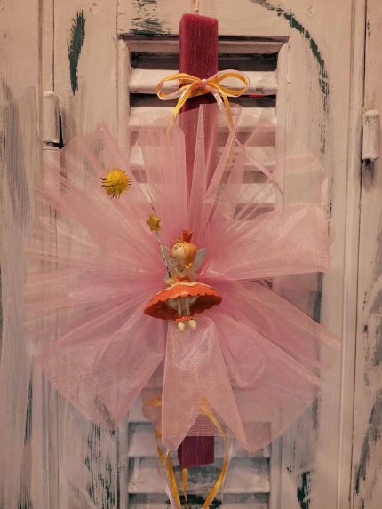 Πασχαλινή λαμπάδα “ρόζ νεραΐδουλα καθιστή με ραβδάκι”